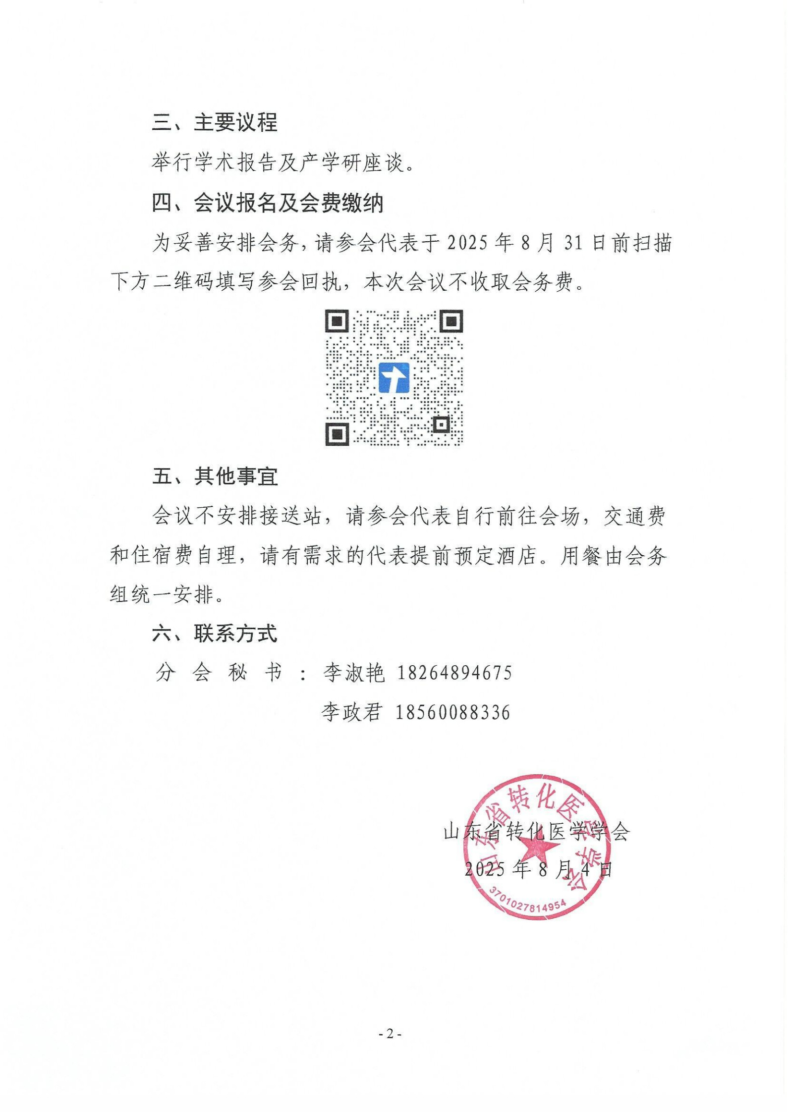 为促进山东省皮肤医学专业在转化医学领域高质量发展,规范和提高全省皮肤科医生炎性疾病及皮肤外科疾 病的诊疗水平,山东省转化医学学会定于2025年9月19日-20日在泰安市召开山东省转化医学学会皮肤医学分会第二届学术会议暨泰安市医学会皮肤病学专业委员会2025年学术会议,进行学术报告交流。会议信息详见附件。